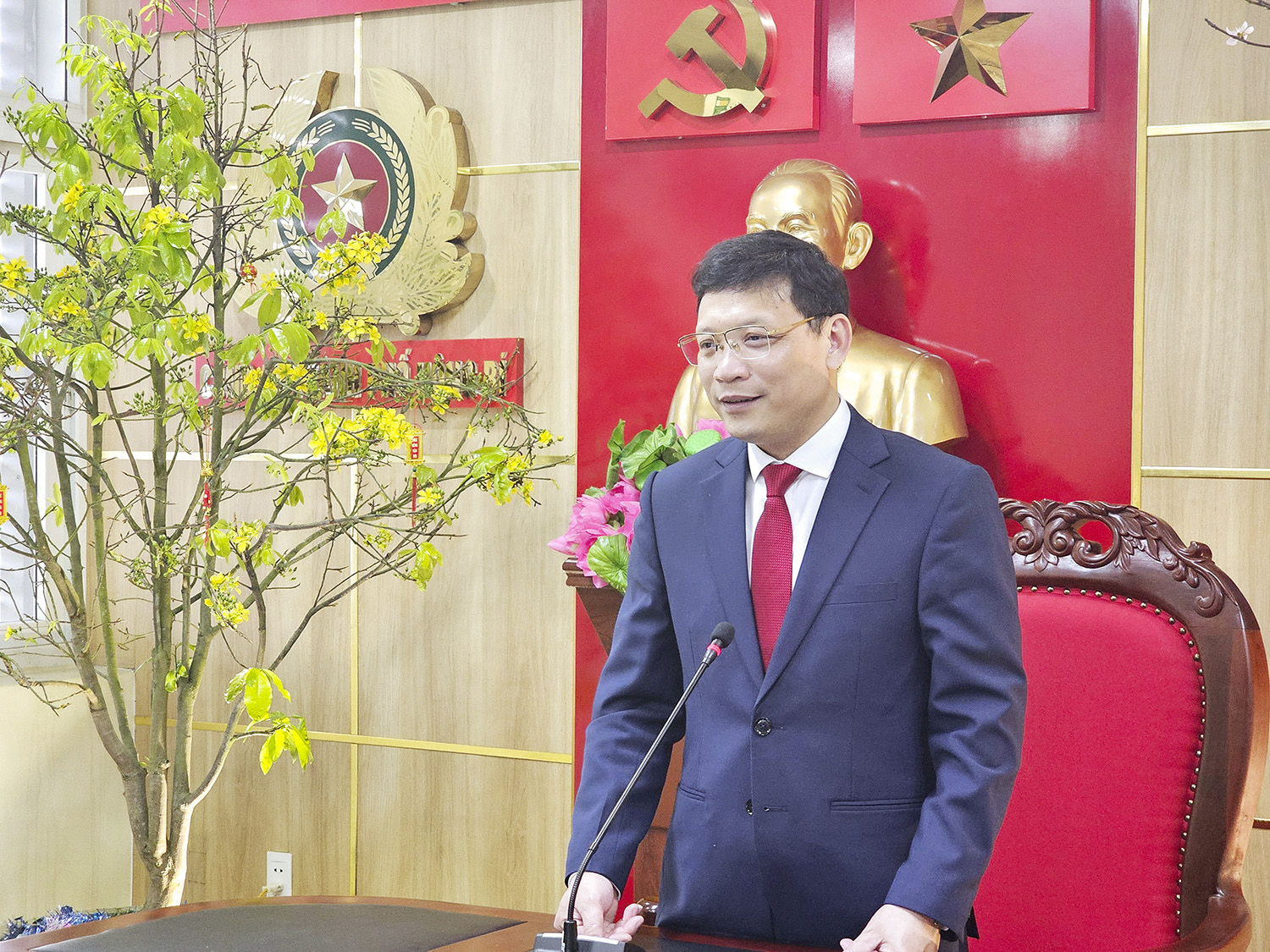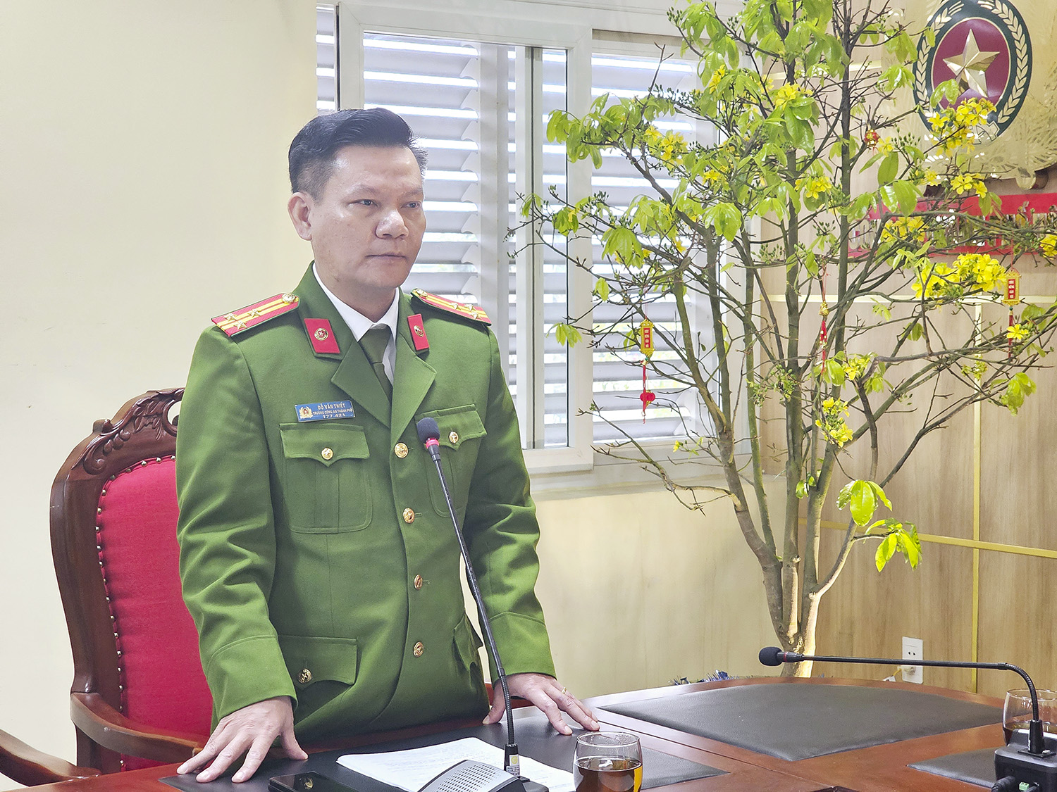 Đồng chí Nghiêm Xuân Cường, Tỉnh ủy viên, Bí thư Thành ủy, Chủ tịch HĐND thành phố phát biểu tại buổi gặp mặt chúc Tết cán bộ chiến sỹ Công an thành phố.