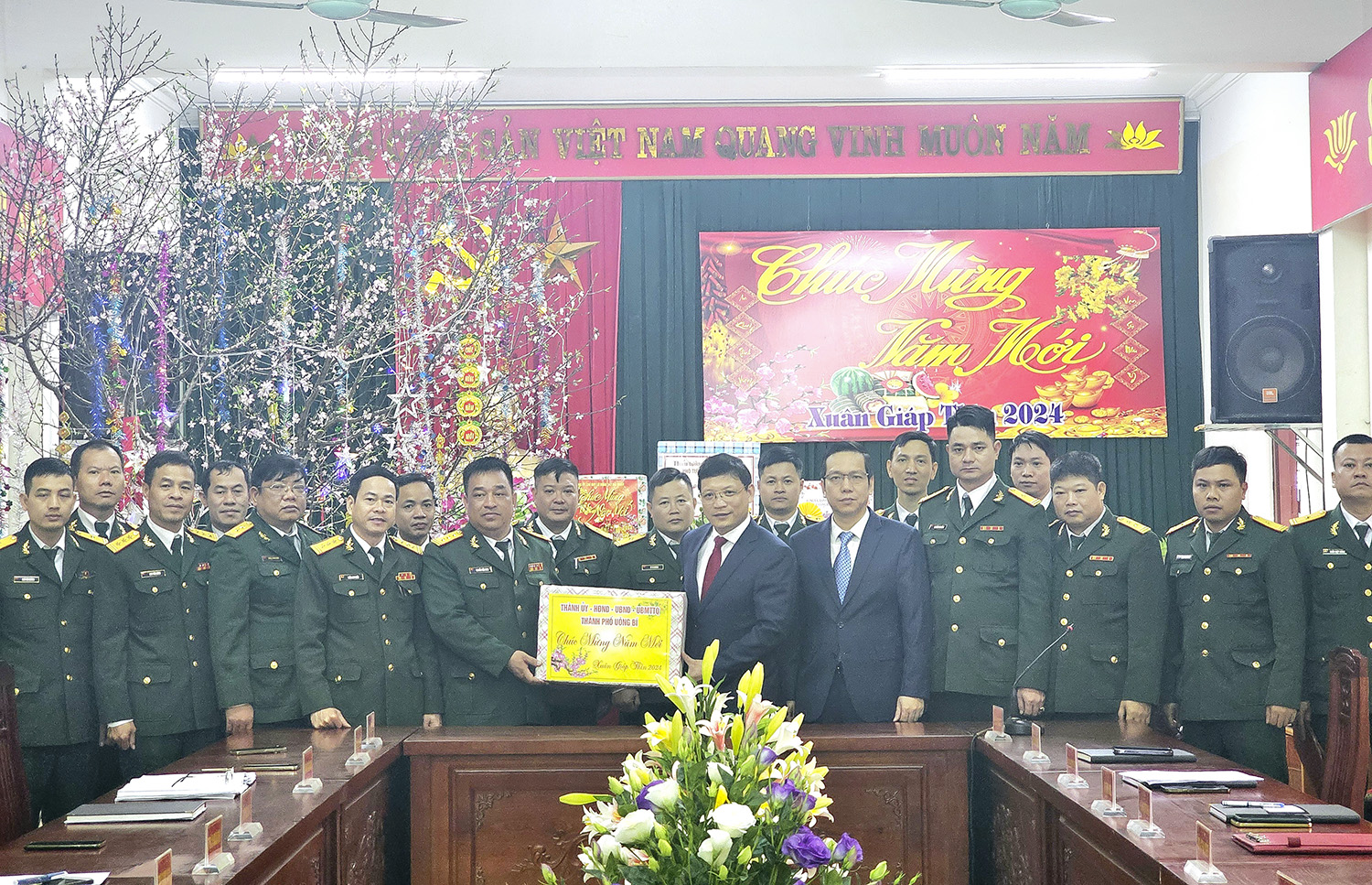 Đồng chí Bí thư Thành ủy Uông Bí tặng quà chúc Tết cán bộ chiến sỹ Ban CHQS thành phố.