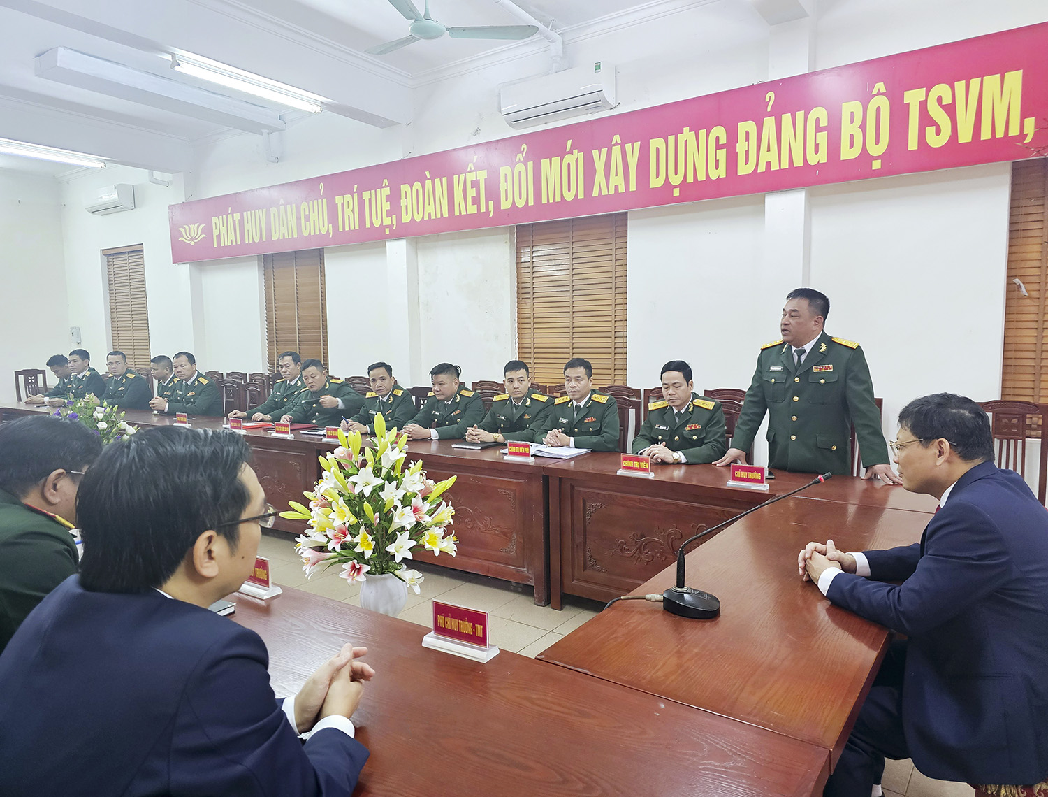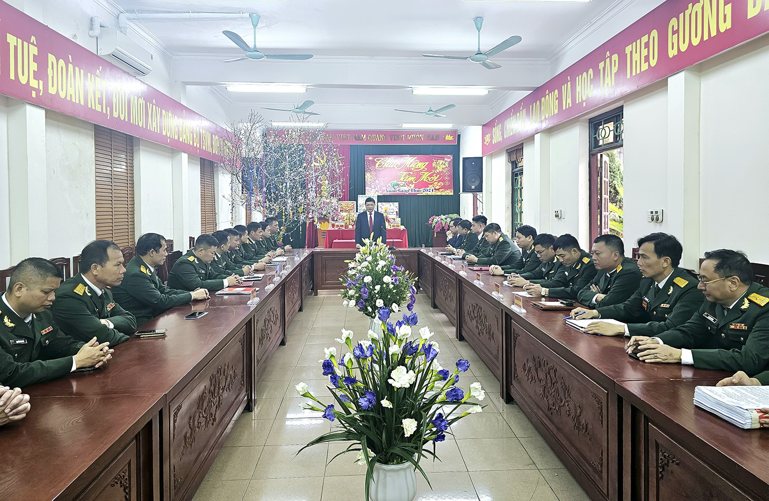 Tại Ban CHQS thành phố, đồng chí Nghiêm Xuân Cường, Tỉnh ủy viên, Bí thư Thành ủy, Chủ tịch HĐND thành phố đã thân ái gửi lời chúc mừng năm mới tốt đẹp nhất tới toàn thể cán bộ, chiến sĩ đơn vị cùng gia đình năm mới mạnh khỏe, hạnh phúc, thành công. Đồng thời, biểu dương thành tích của Ban CHQS thành phố đạt được thời gian qua, đặc biệt là công tác tham mưu cho Thành ủy, UBND thành phố trong lãnh đạo, chỉ đạo triển khai thực hiện hiệu quả công tác quân sự, quốc phòng. Đồng chí Bí thư Thành uỷ đề nghị lãnh đạo Ban CHQS thành phố và các cơ quan, đơn vị trong lực lượng vũ trang thành phố tiếp tục phát huy thành tích đạt được, hoàn thành xuất sắc các nhiệm vụ được giao, trước mắt là đảm bảo giữ vững an ninh chính trị - quốc phòng địa phương dịp Tết Nguyên đán Giáp Thìn 2024.