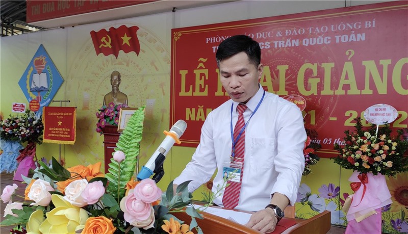 Hiệu trưởng Trường THCS Trần Quốc Toản đọc diễn văn khai giảng.