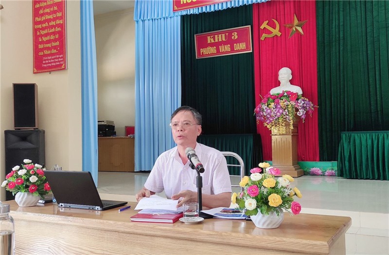 Đồng chí Bùi Huy Thục, Thành uỷ viên, Bí thư Đảng uỷ, Chủ tịch UBND phường Vàng Danh phát biểu tại buổi sinh hoạt.