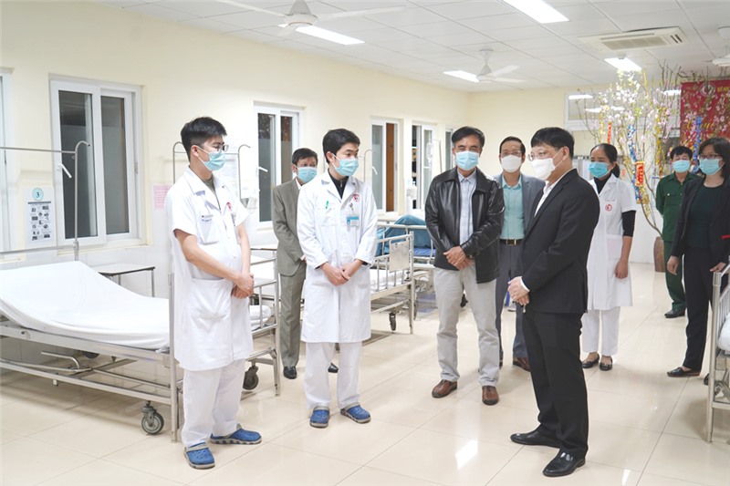 Đồng chí Nghiêm Xuân Cường, Tỉnh ủy viên, Bí thư Thành ủy hỏi thăm sức khỏe bệnh nhân đang điều trị tại khoa hồi sức cấp cứu - Bệnh viện Việt Nam - Thụy Điển Uông Bí.