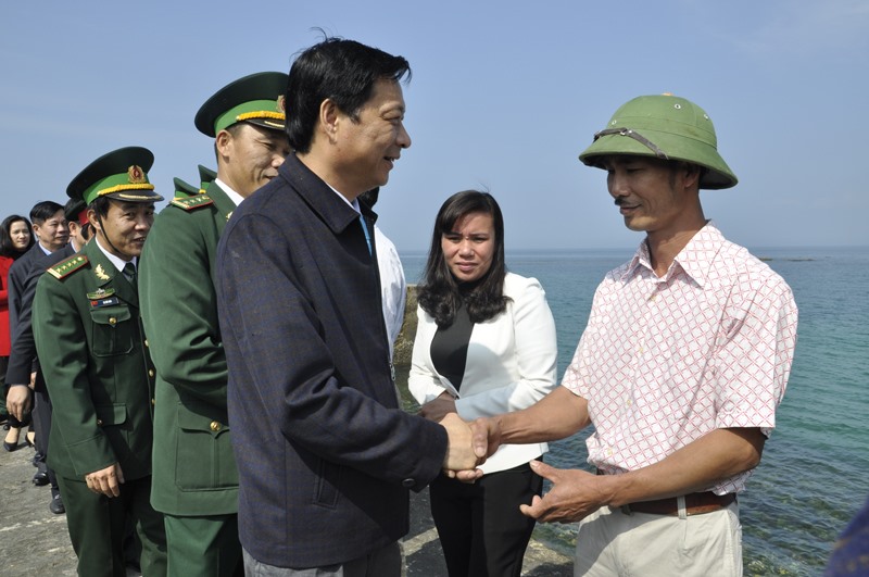 Đồng chí Bí thư Tỉnh ủy động viên người dân trên đảo Trần tiếp tục tham gia phát triển kinh tế, xây dựng đảo Trần ngày một phát triển.