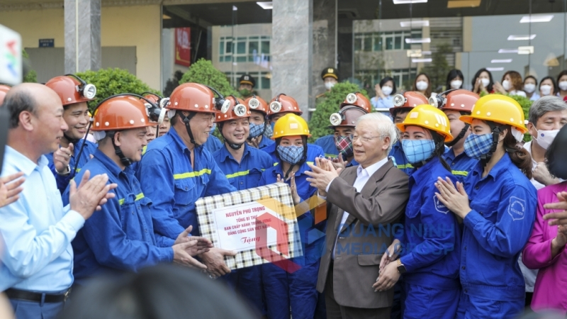 Tổng Bí thư Nguyễn Phú Trọng thăm hỏi, động viên cán bộ, công nhân viên Công ty CP than Vàng Danh tại khuôn viên khu tập thể 314 của đơn vị. Ảnh Hùng Sơn