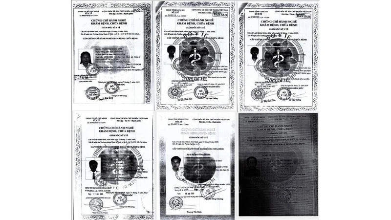 Các chứng chỉ hành nghề này giả mạo các cơ quan cấp gồm: Sở Y tế Thành phố Hồ Chí Minh, Long An, Bình Dương, Quảng Nam... Chứng chỉ giả gồm nhiều lĩnh vực khác nhau như: xét nghiệm, kỹ thuật viên chẩn đoán hình ảnh, chuyên khoa răng hàm mặt, chuyên ngành sản phụ khoa...
