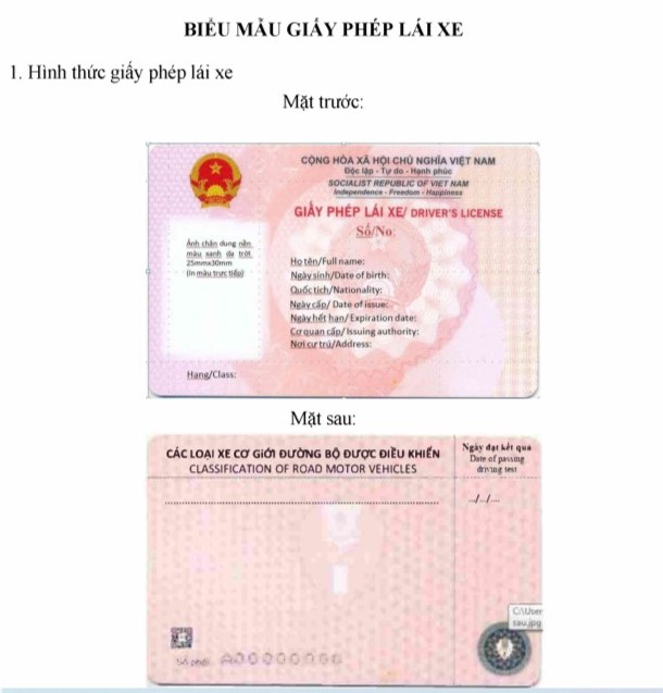 Cụ thể, GPLX là một tài liệu (in bằng tiếng Việt và tiếng Anh) bao gồm các thông tin như: Có lớp màng phủ bảo an trên 2 mặt. Trong đó, mặt trước hiển thị những thông tin sau: Số bằng lái, họ tên của người lái xe, ngày sinh, quốc tịch, ngày cấp, ngày hết hạn, cơ quan cấp, nơi cư trú, hạng.