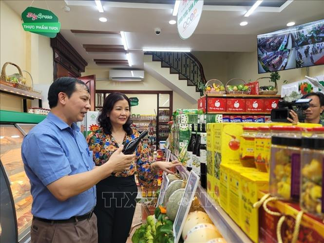 Điểm OCOP tại Cửa hàng thực phẩm số 79 Trần Nguyên Đán, phường Định Công (Hà Nội). Ảnh: TTXVN phát