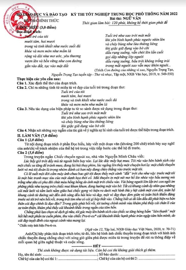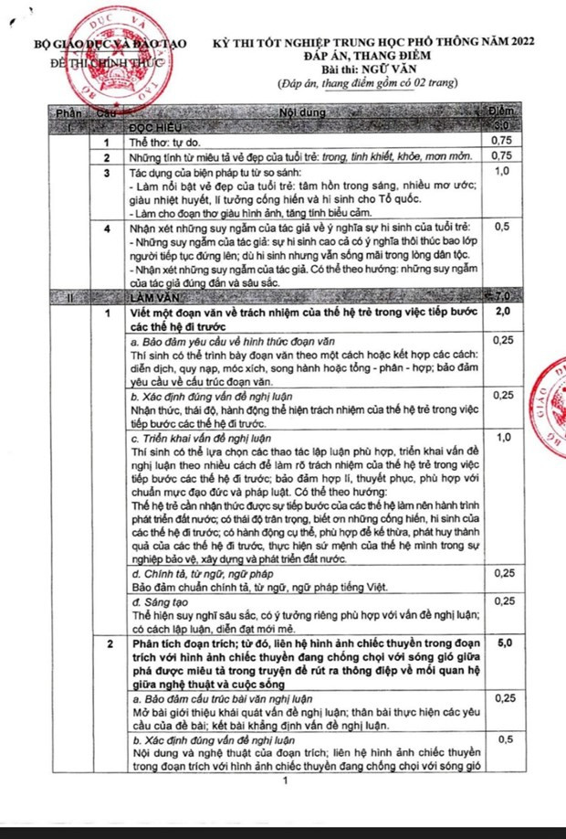 Bộ Giáo dục và Đào tạo đã công bố đáp án môn thi Ngữ văn, Kỳ thi tốt nghiệp trung học phổ thông năm 2022. Đáp án cũng đã được bộ gửi về hội đồng thi các địa phương.