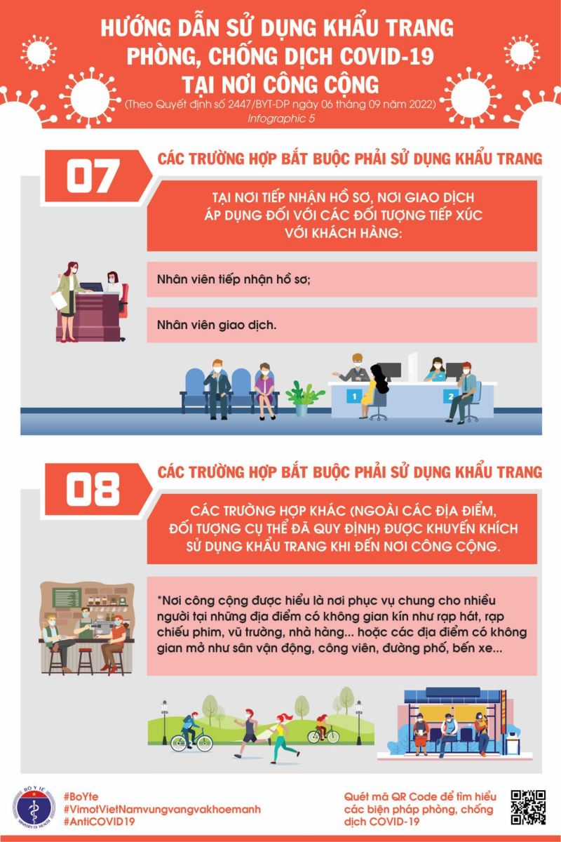 - Tại cơ sở y tế; nơi cách ly; nơi lưu trú có người đang cách ly hoặc đang theo dõi, giám sát y tế: Áp dụng với tất cả đối tượng (trừ người cách ly ở phòng đơn; người bị suy hô hấp, người bệnh đang thực hiện thủ thuật y tế, trẻ dưới 5 tuổi). Đối với nhân viên y tế tại cơ sở khám, chữa bệnh thực hiện theo Hướng dẫn về lựa chọn và sử dụng phương tiện phòng hộ cá nhân trong phòng, chống bệnh dịch COVID-19 tại cơ sở khám bệnh, chữa bệnh được ban hành kèm theo Quyết định số 2171/QĐ-BYT ngày 05/8/2022 của Bộ Y tế.