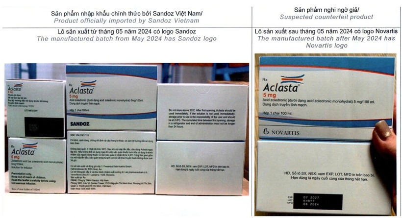 Hình ảnh thuốc Aclasta chính hãng (trái) và sản phẩm nghi ngờ là hàng giả (phải). (Ảnh: Cục Quản lý Dược)