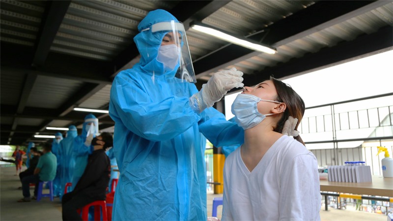 Nhân viên y tế lấy mẫu xét nghiệm COVID-19. Ảnh: HOÀNG GIANG