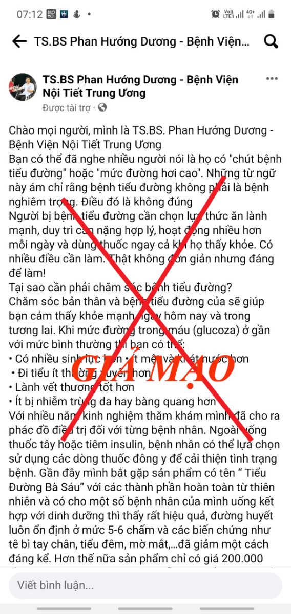 Liên quan đến những thông tin này, mới đây, TS.BS Phan Hướng Dương - Phó Giám đốc Bệnh viện Nội tiết Trung ương đã lên tiếng về việc bị kẻ xấu lập Facebook giả mạo tên tuổi để quảng cáo bán thuốc điều trị bệnh đái tháo đường và đưa ra các thông tin sai lệch về bệnh này. Đồng thời PGS.TS Hướng Dương lưu ý người dân cần cẩn trọng trước các thông tin trên mạng xã hội để tránh bị lừa đảo, đồng thời đã báo cáo cơ quan chức năng xử lý. Mới đây nhất, Bệnh viện TW Quân đội 108 nhận được một đoạn clip có âm thanh và ký tự trên clip mạo danh bác sĩ của Bệnh viện chia sẻ và giới thiệu cuốn sách mang tên "Minh triết trong ăn uống của người phương Đông". Cụ thể, người này khẳng định cuốn sách mới có thể chữa bệnh cho mọi người chứ không phải các phương pháp y học hiện đại. Không những vậy, một số cá nhân đã chia sẻ đoạn clip trên lên trang Facebook, tiêu biểu như tài khoản H.V.N (có đến 203.000 người theo dõi) nhằm tạo niềm tin rằng "bác sĩ Quân y 108" đã khẳng định chỉ cần áp dụng "liệu pháp chữa lành tự nhiên" là "chữa tất cả" và dần dẫn dắt người dân mua thực phẩm chức năng. Theo Bệnh viện TW Quân đội 108, việc mạo danh, lấy thương hiệu "bác sĩ Quân y 108" để trục lợi cá nhân, mua bán các thực phẩm chức năng, thuốc, sách… làm ảnh hưởng tới uy tín của Bệnh viện TW Quân đội 108, ảnh hưởng nghiêm trọng đến sức khỏe của người dân, tạo những tư tưởng sai sự thật. |