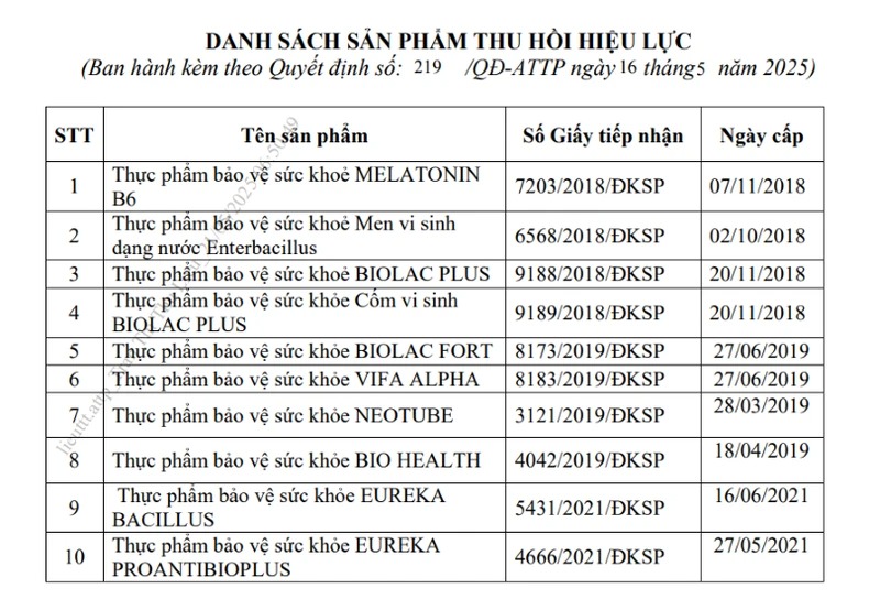 Cụ thể, Cục An toàn thực phẩm đã thu hồi hiệu lực giấy tiếp nhận đăng ký bản công bố sản phẩm đối với 10 sản phẩm thực phẩm bảo vệ sức khỏe do Công ty cổ phần Công nghệ sinh phẩm Nam Việt (địa chỉ: lô A3-A4 Cụm công nghiệp vừa và nhỏ, xã Diên Phú, huyện Diên Khánh, tỉnh Khánh Hòa) công bố.