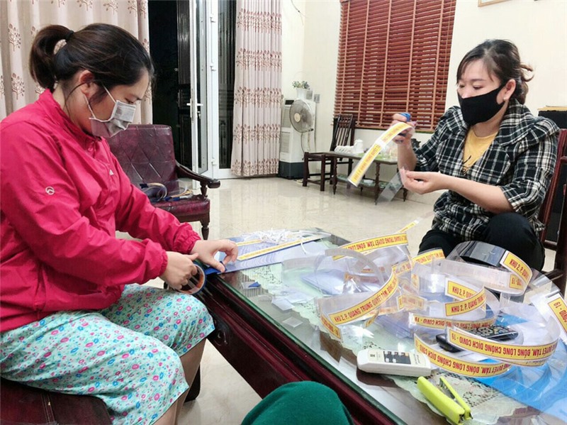 Hội viên, phụ nữ khu 2, phường Quang Trung làm 350 chiếc mũ kính tặng các lực lượng chống dịch.