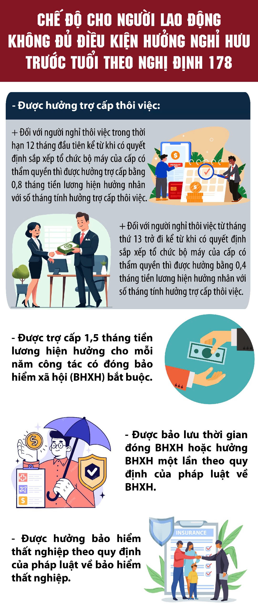 Người lao động không đủ điều kiện hưởng nghỉ hưu trước tuổi theo Nghị định 178, nghỉ thôi việc sẽ được hưởng một số chế độ dưới đây.