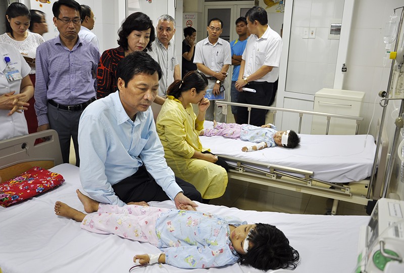 Các đồng chí Nguyễn Văn Đọc, Bí thư Tỉnh ủy, Chủ tịch HĐND tỉnh; Vũ Thị Thu Thủy, Phó Chủ tịch UBND tỉnh thăm 2 nạn nhân nhỏ tuổi trong vụ tai nạn tại Bệnh viện Sản - Nhi Quảng Ninh.