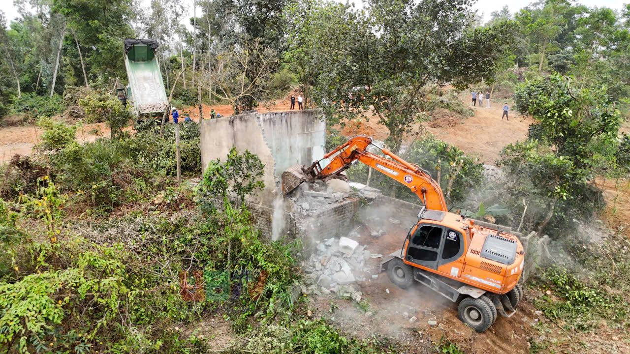 Đơn vị thi công đang triển khai máy móc, phương tiện tạo mặt bằng thi công dự án.