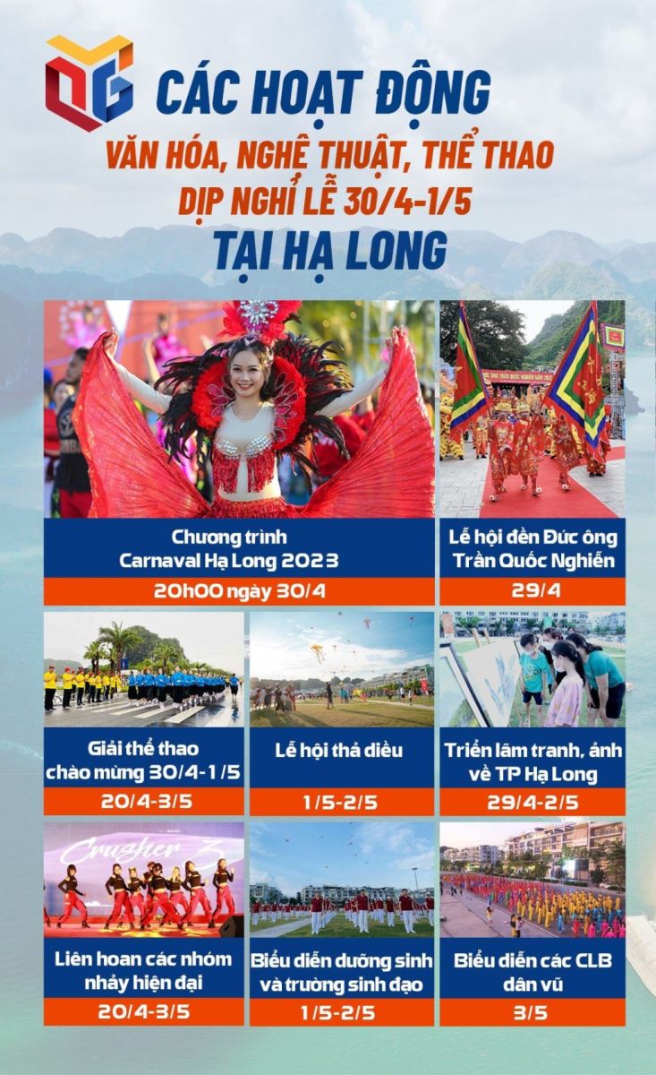 Dịp nghỉ lễ 30/4-1/5 năm nay, thành phố Hạ Long sẽ tổ chức nhiều hoạt động văn hóa, văn nghệ, thể thao nhằm chào mừng kỷ niệm 64 năm giải phóng Khu mỏ (25/4), 48 năm ngày giải phóng miền Nam thống nhất đất nước (30/4) và Quốc tế Lao động (1/5); hưởng ứng, triển khai hiệu quả chương trình kích cầu du lịch, tạo sản phẩm du lịch đặc sắc, hấp dẫn với du khách và khẳng định Hạ Long là điểm đến "An toàn, thân thiện, hấp dẫn".
