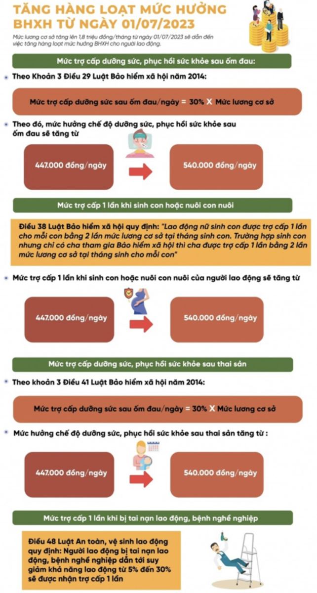 Theo đó, lương cơ sở tăng từ 1,49 triệu đồng/tháng lên thành 1,8 triệu đồng/tháng thì mức hưởng chế độ dưỡng sức, phục hồi sức khỏe sau ốm đau sẽ tăng từ 447.000 đồng/ngày lên thành 540.000 đồng/ngày.