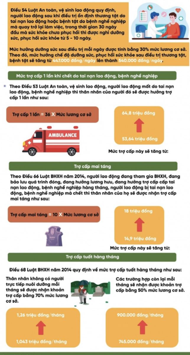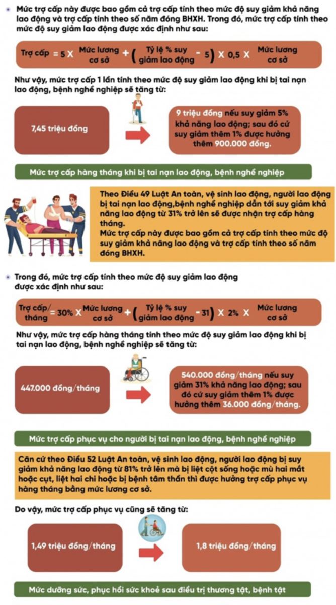 Với mức lương cơ sở 1,8 triệu đồng/tháng, mức trợ cấp hàng tháng tính theo mức độ suy giảm lao động khi bị tai nạn lao động, bệnh nghề nghiệp sẽ tăng từ 447.000 đồng/tháng lên thành 540.000 đồng/tháng nếu suy giảm 31% khả năng lao động; sau đó cứ suy giảm thêm 1% được hưởng thêm 36.000 đồng/tháng.