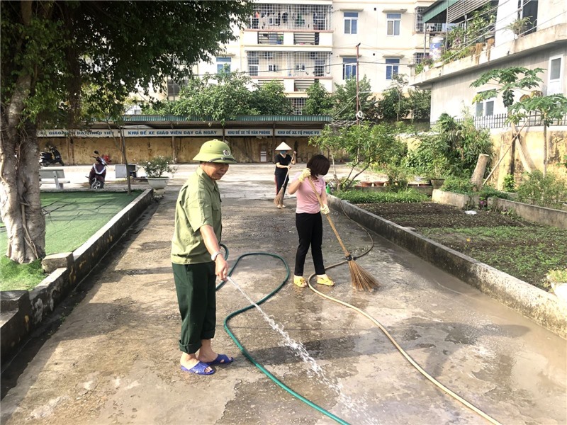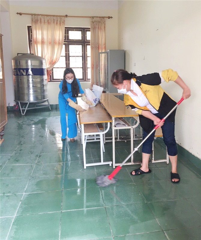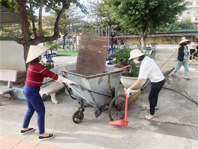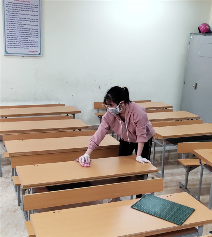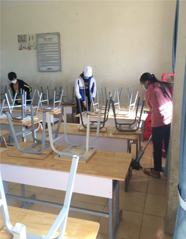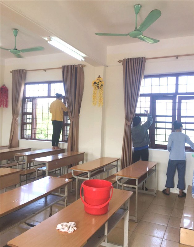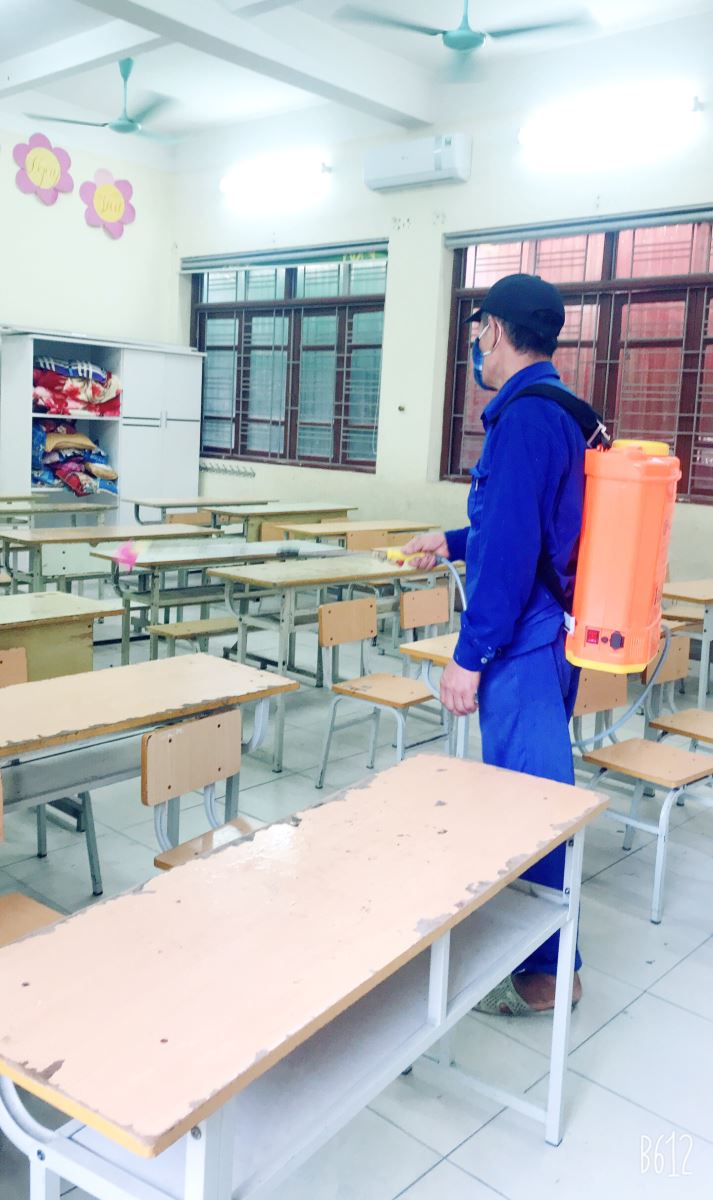 Bên cạnh đó, các trường tiến hành phun khử khuẩn và tổng vệ sinh kỹ lưỡng khu vực phía ngoài các lớp học và toàn bộ trường. Phía bên trong lớp học tiến hành lau khử khuẩn toàn bộ bàn ghế, dụng cụ, tay nắm cửa… theo đúng hướng dẫn của ngành y tế.