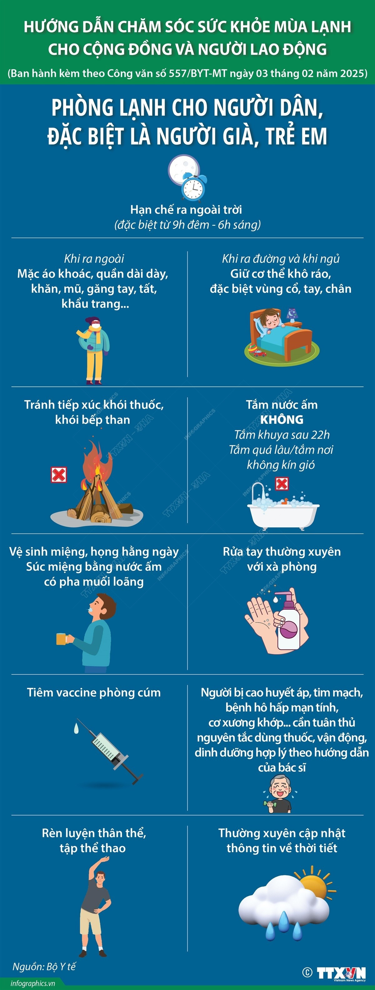 Luôn giữ cơ thể khô ráo, tránh bị ẩm ướt đặc biệt là vùng cổ, tay, chân mỗi khi ra đường và khi ngủ để hạn chế các bệnh do cảm lạnh… là những biện pháp dự phòng bảo vệ sức khoẻ mùa lạnh cho người dân, đặc biệt là người già và trẻ em./.
