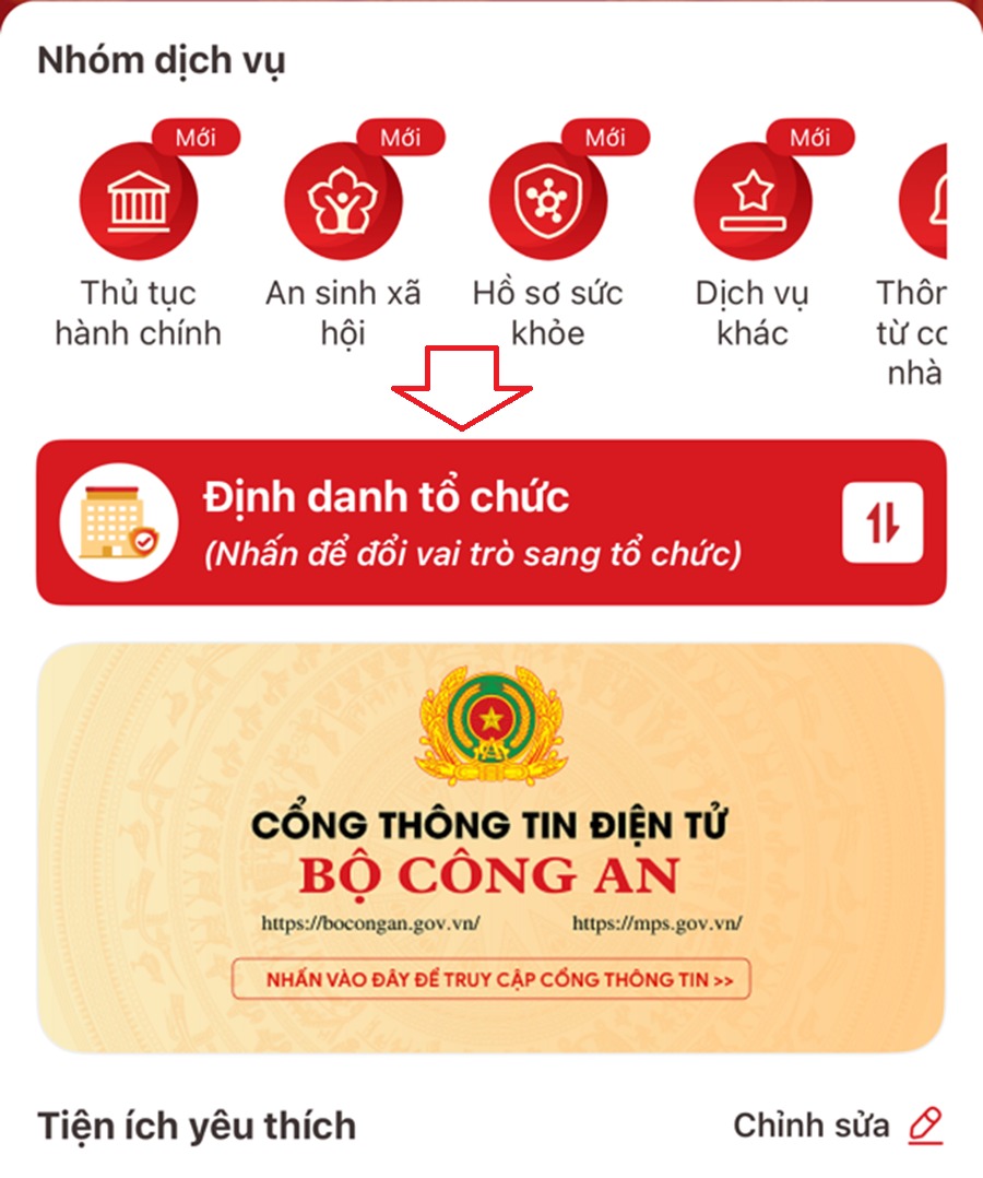 Bước 1: Người đại diện pháp luật, người đứng đầu cơ quan, tổ chức hoặc người được ủy quyền đăng nhập tài khoản mức độ 2 chọn chức năng tài khoản định danh tổ chức trên ứng dụng VNeID.