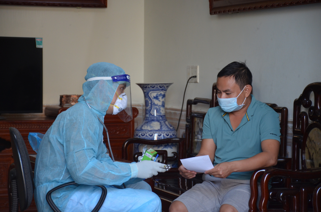 Trường hợp F1 cách ly tại nhà mắc bệnh lý nền được nhân viên Trạm Y tế lưu động xã Hồng Thái Đông (TX Đông Triều) theo dõi, cấp phát thuốc điều trị.