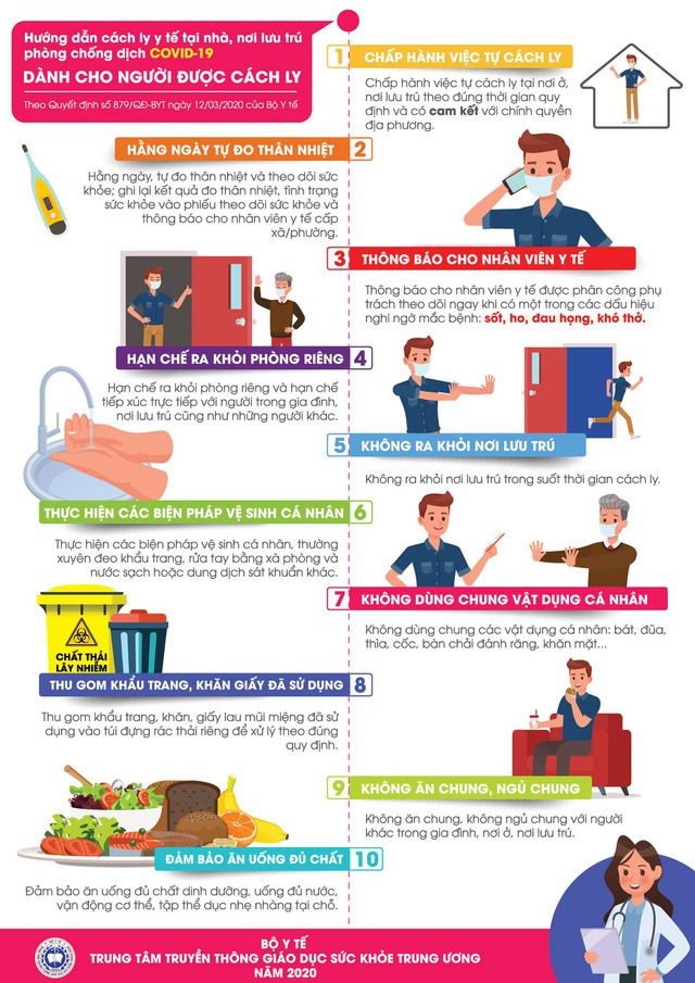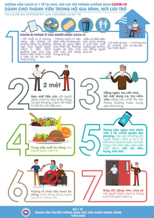 Người được cách ly cần phải hạn chế ra khỏi phòng riêng, hạn chế tiếp xúc trực tiếp với những người trong gia đình, nơi lưu trú cũng như những người khác. Tuyệt đối không ra khỏi nơi ở, nơi lưu trú trong suốt thời gian cách ly.