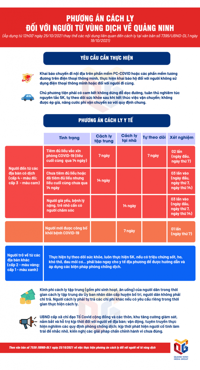 Để kịp thời khắc phục tình trạng nêu trên và đảm bảo thích ứng an toàn, linh hoạt, kiểm soát hiệu quả dịch Covid-19 theo hướng dẫn của Chính phủ trong tình hình dịch bệnh hiện nay, UBND tỉnh Quảng Ninh đã lập tức điều chỉnh phương án cách ly đối với người từ vùng dịch về Quảng Ninh tại văn bản số 7539/UBND-DL1 ngày 25/10/2021. Theo đó từ 12h ngày 25/10/2021, tất cả người đến từ các địa bàn có dịch (cấp 4 - vùng màu đỏ; cấp 3 - vùng màu cam) đều thực hiện cách ly y tế tập trung từ 7 đến 14 ngày, tùy theo trường hợp đã tiêm đủ thời gian, liều lượng vắc-xin phòng Covid-19 theo quy định. Đối với những người trở về từ các địa bàn khác (cấp 2 - màu vàng và cấp 1 - màu xanh) thực hiện tự theo dõi sức khỏe, luôn thực hiện 5K, nếu có triệu chứng sốt, ho, khó thở, đau mỏi cơ... phải báo ngay cho y tế địa phương để được hướng dẫn và áp dụng các biện pháp phòng, chống dịch.