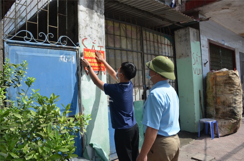 Khu Vĩnh Hồng, phường Mạo Khê, TX Đông Triều, thực hiện dán bảng thông báo gia đình có người cách ly phòng, chống dịch Covid-19.