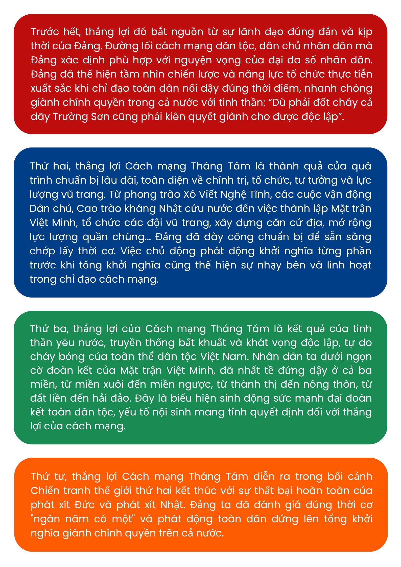 Cách mạng Tháng Tám năm 1945 giành thắng lợi là kết quả tổng hòa của nhiều yếu tố, trong đó nổi bật là sự kết hợp chặt chẽ giữa thời cơ lịch sử thuận lợi với sự chuẩn bị công phu, bài bản và sự lãnh đạo sáng suốt, linh hoạt của Đảng ta do Chủ tịch Hồ Chí Minh đứng đầu.
