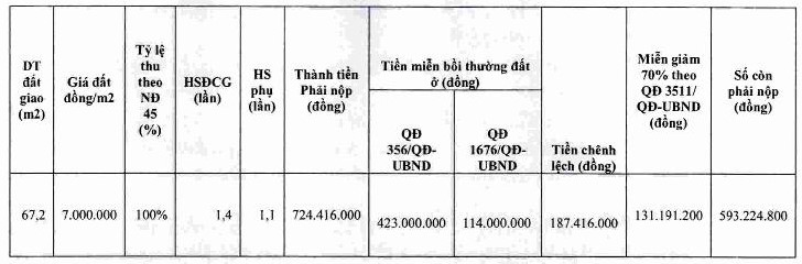 Diện tích thửa đất: 67,2 m2; diện tích đất cấp mới: 67,2 m2; diện tích phải nộp tiền sử dụng đất: 67,2 m2