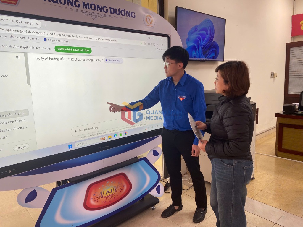 Đoàn viên thanh niên hướng dẫn người dân sử dụng trợ lý ảo AI hỗ trợ giải quyết TTHC tại phường Mông Dương.