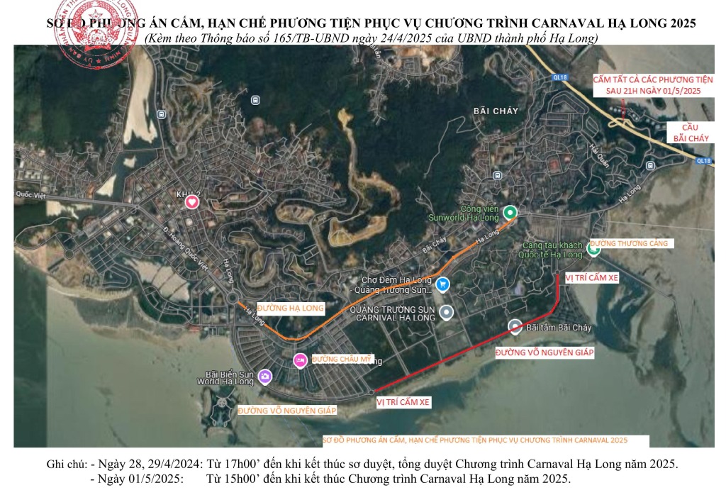 Thời gian thực hiện: Ngày 28, 29/4/2025, từ 17 giờ đến khi kết thúc sơ duyệt, tổng duyệt Chương trình Carnaval Hạ Long năm 2025. Ngày 1/5/2025: từ 15 giờ đến khi kết thúc Chương trình Carnaval Hạ Long năm 2025.