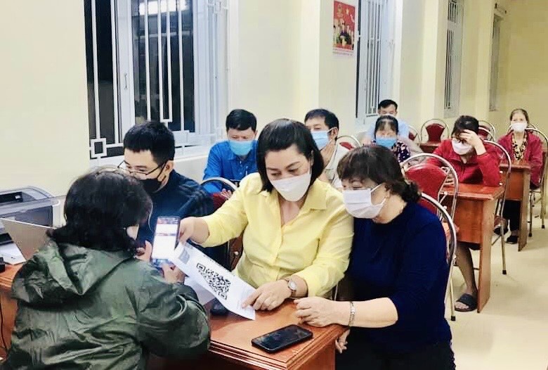 Chị Đinh Mạc Phương Thuý, Chủ tịch Hội LHPN phường Quang Trung (áo vàng) tuyên truyền cho người dân về quét mã QR phòng, chống dịch Covid - 19.