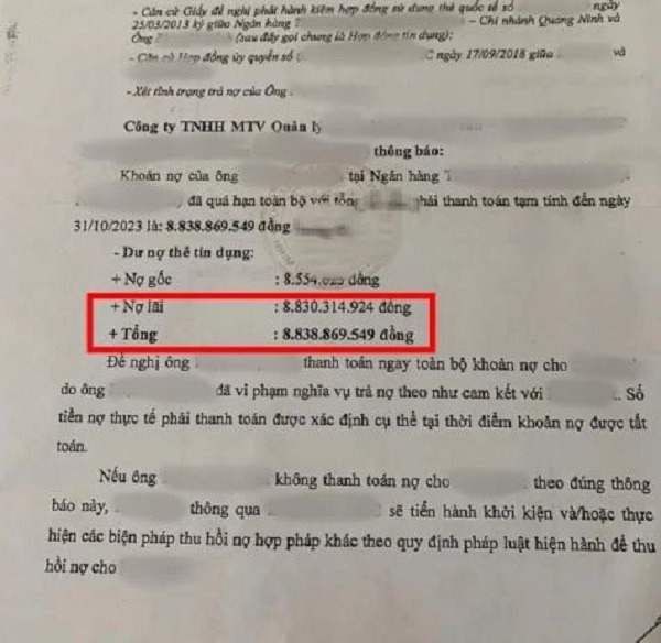 Đến 30/10/2023, ngân hàng đã gửi thông báo về khoản nợ quá hạn toàn bộ đối với khoản vay này của người đàn ông với tổng số tiền phải thanh toán là 8.838.869.549 đồng, trong đó nợ lãi là 8.830.314.924 đồng.