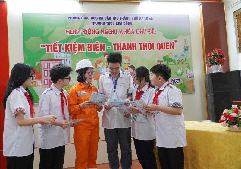 Điện lực TP Hạ Long tuyên truyền về việc tiết kiệm điện tới các em học sinh.