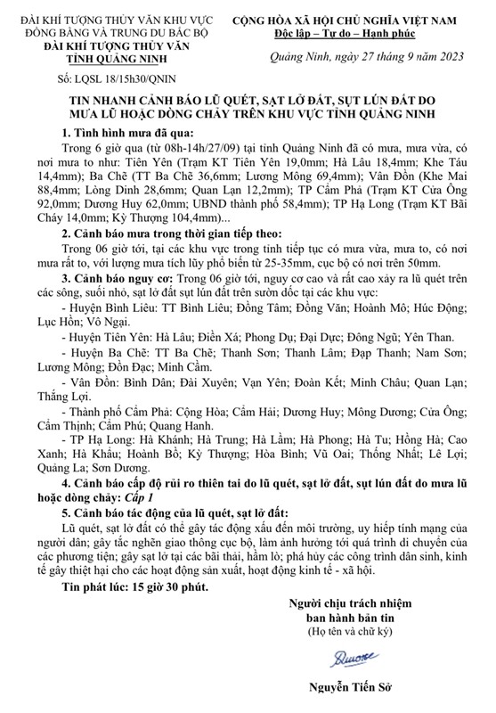 Cảnh báo lũ quét, sạt lở đất, sụt lún đất do mưa lũ hoặc dòng chảy trên khu vực tỉnh Quảng Ninh