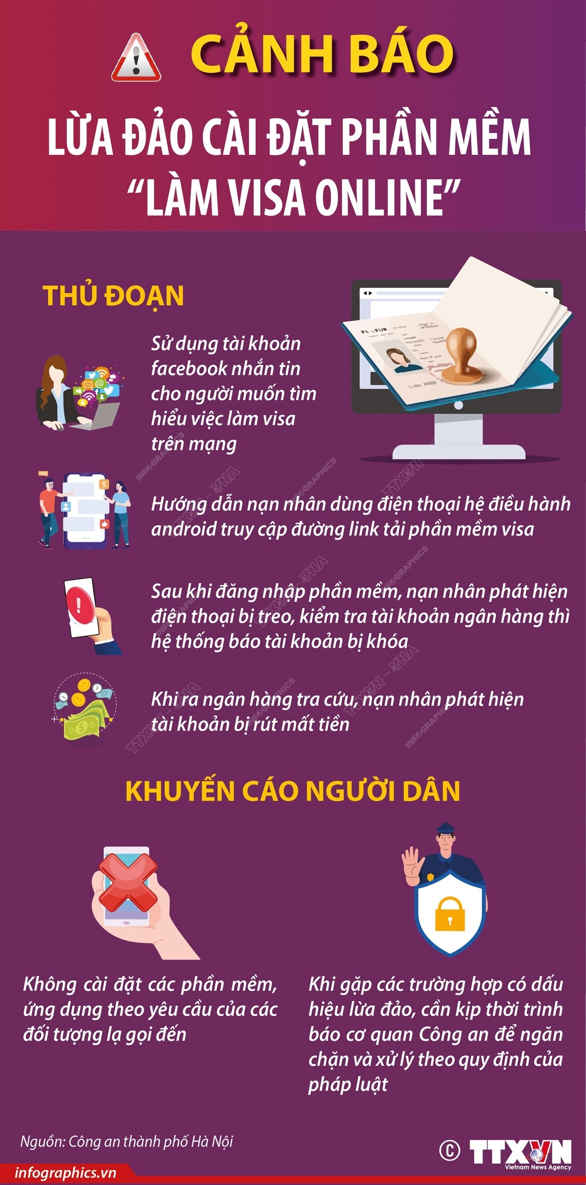 Công an thành phố Hà Nội cho biết, nắm bắt được nhu cầu làm visa đi nước ngoài ngày càng tăng cao, nhiều đối tượng đã lợi dụng sự cả tin của người dân để thực hiện các chiêu trò lừa đảo bằng thủ đoạn cài đặt phần mềm “làm visa online”. Công an thành phố Hà Nội đề nghị người dân cảnh giác.