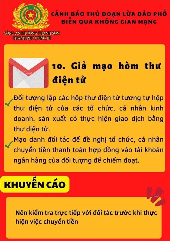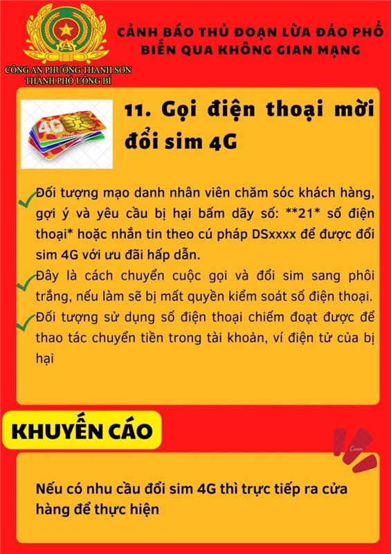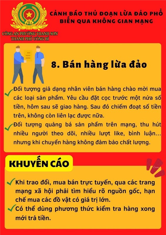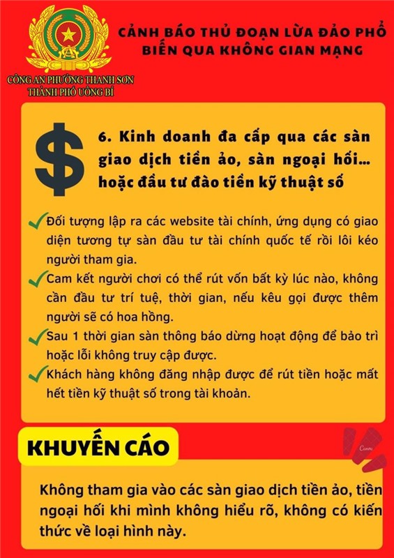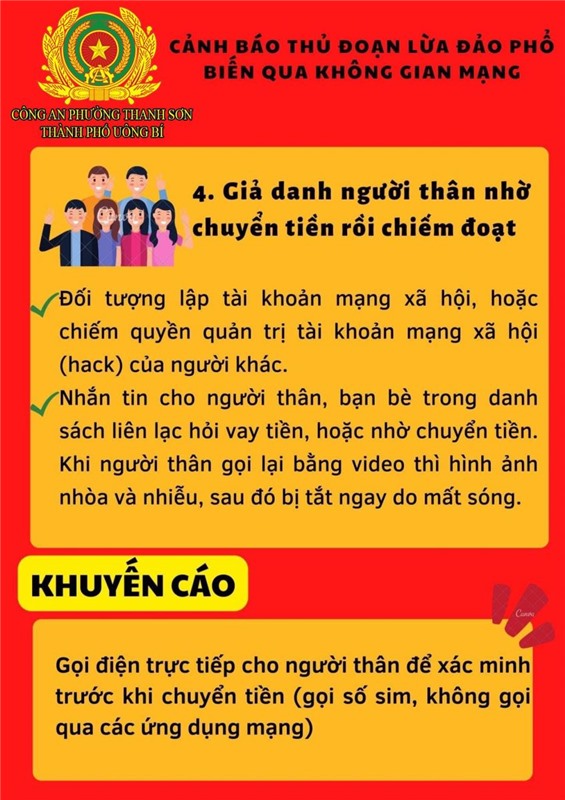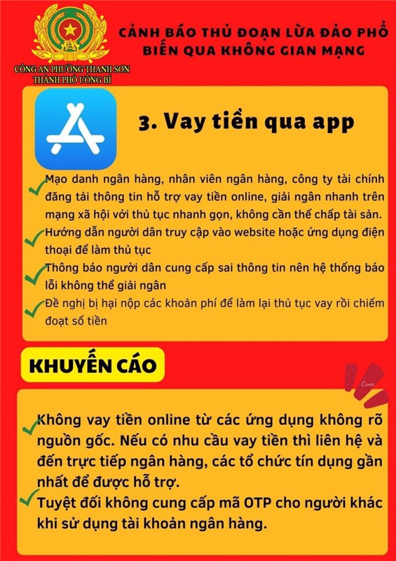 Để làm tốt công tác phòng ngừa tội phạm “Lừa đảo chiếm đoạt tài sản” qua mạng Internet, mạng viễn thông, Công an phường Thanh Sơn cảnh báo thủ đoạn lừa đảo phổ biến qua không gian mạng nổi lên trong thời gian gần đây, đề nghị nhân dân nêu cao cảnh giác. Cụ thể: không nhấn vào các đường link lạ, tuyệt đối không cung cấp các thông tin tài khoản ngân hàng cho bất kỳ cá nhân, tổ chức nào thông qua các cuộc gọi, đường link gửi bằng mail/tin nhắn. Nếu người thân, bạn bè nhắn tin vay mượn tiền qua các mạng xã hội thì gọi điện thoại trực tiếp cho người đó để xác minh thông tin chính xác trước khi chuyển tiền; không cung cấp mã OTP do ngân hàng cung cấp hay thực hiện xóa cài đặt xác thực Smart OTP cho bất kỳ ai;thường xuyên kiểm tra và cập nhật các tính năng bảo mật, quyền riêng tư trên các tài khoản ngân hàng, tài khoản mạng xã hội; không cho mượn, thuê các giấy tờ cá nhân liên quan, không nhận chuyển khoản ngân hàng hoặc nhận tiền chuyển khoản của các ngân hàng cho người không quen biết.