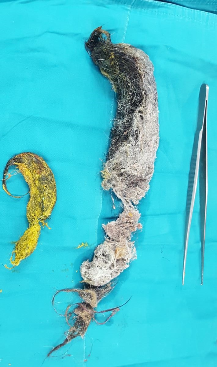 Theo lời kể của gia đình, khoảng 6 tháng gần đây, cháu N. có biểu hiện ăn tóc của mình hoặc tóc búp bê, sau đó cháu nôn, trong phân có tóc. Trước vào viện 1 ngày, mẹ cháu phát hiện con ăn tóc búp bê và sau đó cháu đau bụng nhiều, có biểu hiện nôn. Gia đình đưa cháu đến bệnh viện Việt Nam - Thụy Điển Uông Bí để khám. N. nhập viện trong tình trạng đau bụng nhiều, sờ vùng thượng vị có khối rắn chắc. Tiến hành nội soi dạ dày của bé, bác sỹ thấy một khối cục bã thức ăn rắn chắc gồm tóc, bông gòn, kim tuyến và một số cục bã thức ăn khác.