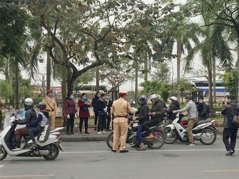 Một số hình ảnh CBCS Đội CSGT Công an thành phố cùng phật tử chùa Ba Vàng phát khẩu trang miễn phí cho người tham gia giao thông: