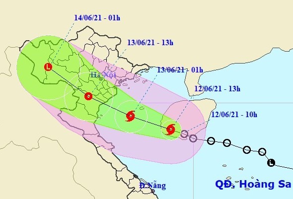 Dự báo trong 12 giờ tới, bão di chuyển theo hướng Tây Tây Bắc, đến 01h/13/6, tâm bão ngay trên vùng biển từ Hải Phòng đến Nghệ An; sau đi vào đất liền và ảnh hưởng trực tiếp đến các các tỉnh Đông Bắc Bộ, Bắc Trung Bộ.