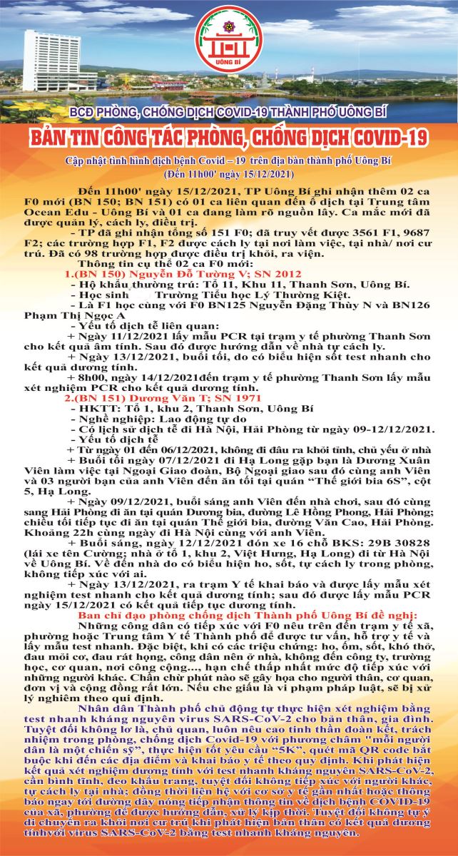 Cập nhật tình hình dịch bệnh Covid-19 trên địa bàn thành phố Uông Bí (đến 11h00' ngày 15/12/2021)