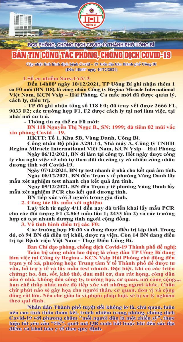 Cập nhật tình hình dịch bệnh Covid-19 trên địa bàn thành phố Uông Bí (đến 14h00' ngày 10/12/2021)