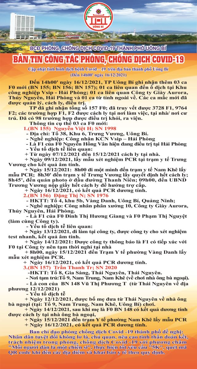 Cập nhật tình hình dịch bệnh Covid-19 trên địa bàn thành phố Uông Bí (đến 14h00' ngày 16/12/2021)