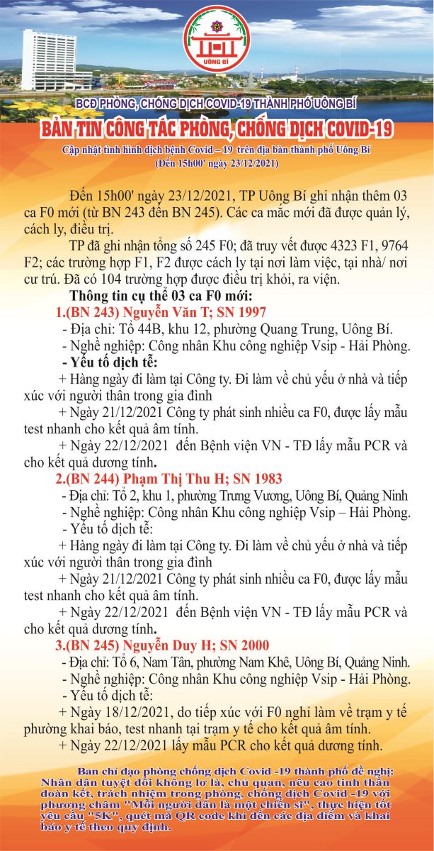 Cập nhật tình hình dịch bệnh Covid-19 trên địa bàn thành phố Uông Bí (đến 15h00 ngày 23/12/2021)