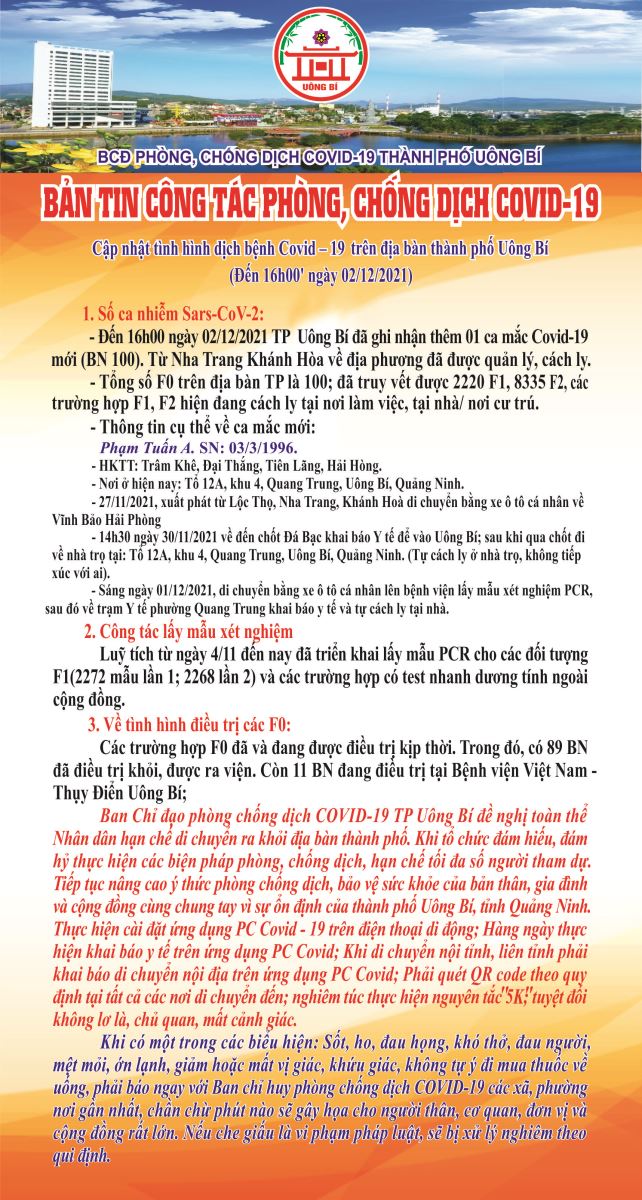 Cập nhật tình hình dịch bệnh Covid-19 trên địa bàn thành phố Uông Bí (Đến 16h00' ngày 02/12/2021)