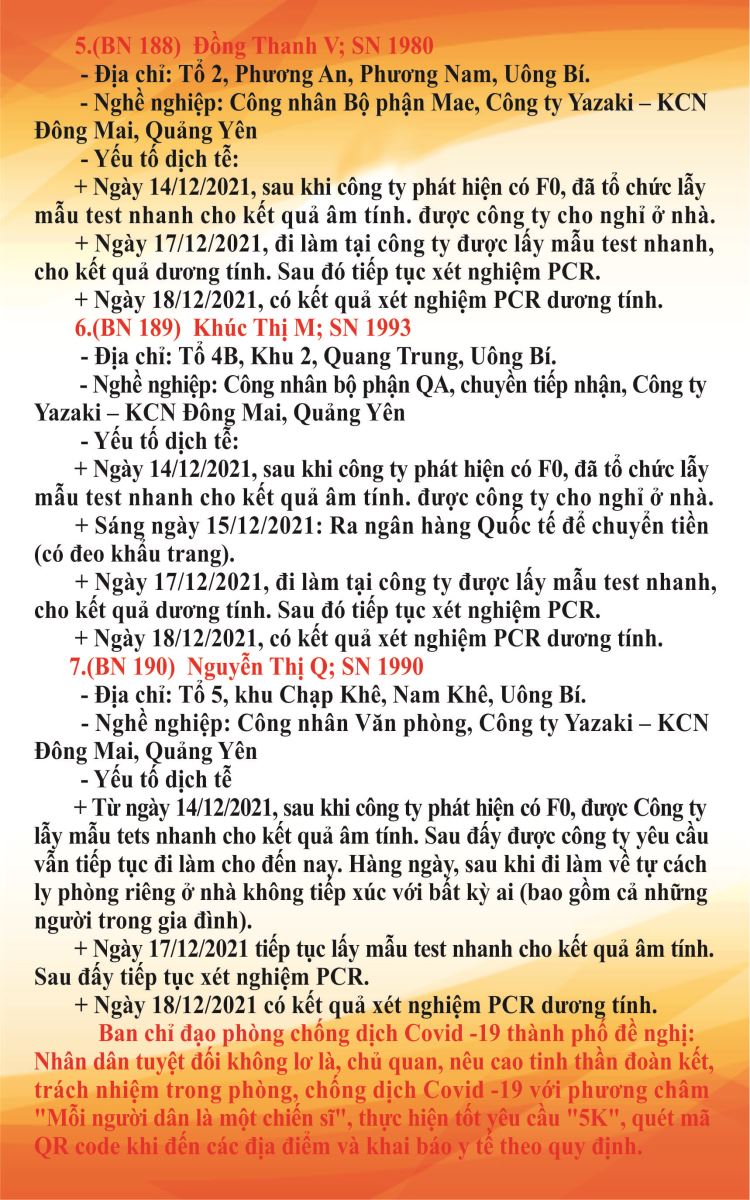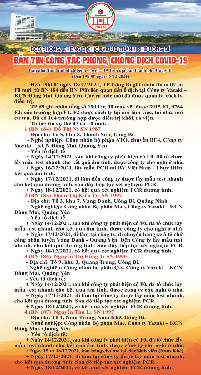 Cập nhật tình hình dịch bệnh Covid-19 trên địa bàn thành phố Uông Bí (đến 19h00' ngày 18/12/2021)